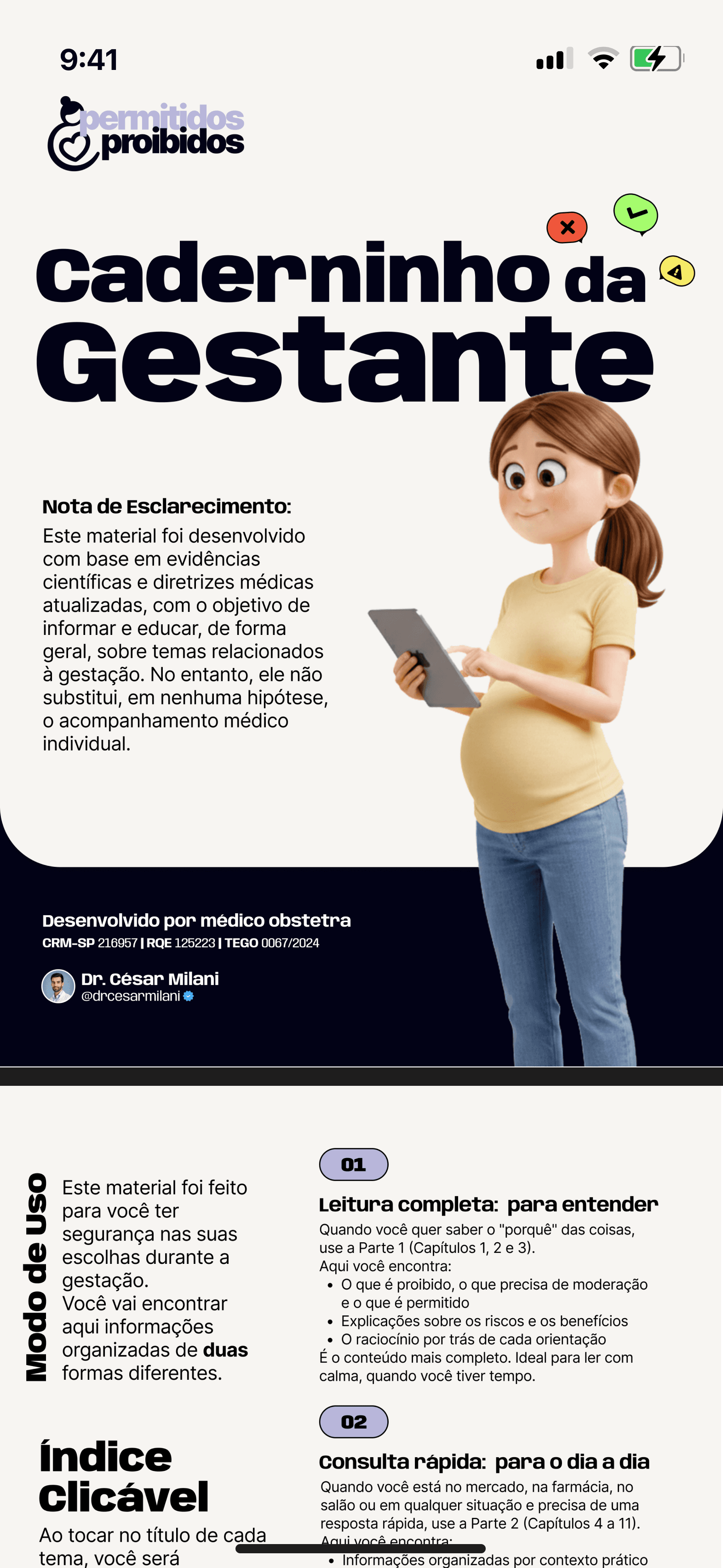Um material feito para acompanhar você na gestação de forma prática e organizada. Nele, você encontra todo o conteúdo das aulas dos três módulos, além de uma divisão inteligente por categorias do dia a dia para acessar exatamente o que precisa, no momento certo.